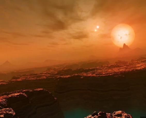 如果你站在這顆行星的表面,由于這顆行星圍繞恒星運行時,距離僅相當于水星到太陽距離的1/10,你抬頭會看到天空中一個巨大的橘色太陽,以及不遠處兩個稍小一些的橘色太陽,它圍繞運行的那顆恒星看上去會顯得非常巨大,因為它距離非常近,而另外兩顆恒星看上去就要遠得多,它們的亮度將大約是我們在地球上看到的金星亮度的 100 倍以上,這兩顆恒星的大小看上去差不多。