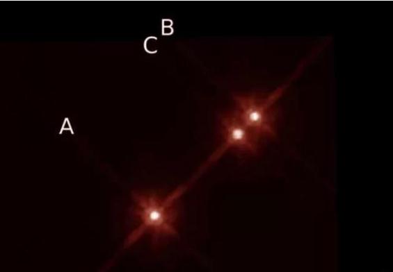 哈勃空間望遠鏡拍攝的三恒星系統(tǒng)圖像。新發(fā)現(xiàn)的系外行星圍繞其中編號為“A”的恒星運行。