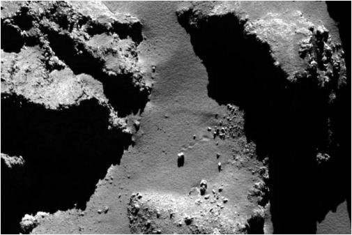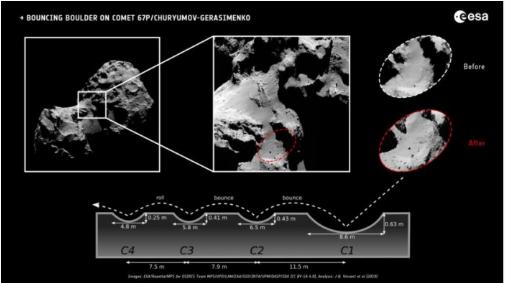 在連接啞鈴形 67P 的兩個(gè)葉片的“頸部”區(qū)域尤其如此,其中一塊 10 米(33 英尺)的巨石從懸崖上掉下來并在最終落下前反彈幾次。