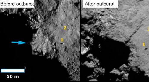 坍塌懸崖還幫助科學(xué)家更好地理解了 67P 的結(jié)構(gòu)。圖像顯示彗星的材料非常脆弱。此外,懸崖沿著弱點(diǎn)坍塌,導(dǎo)致從最初 70 米寬的坍塌發(fā)展為 2000 平方米區(qū)域的坍塌。此外,圖像顯示 67P 接近太陽(yáng)時(shí)增加的熱量使其更加活躍。在近日點(diǎn)之前和之后的圖像(彗星的軌跡使其最接近太陽(yáng)的點(diǎn))表明增加的活動(dòng)改變了表面的程度。