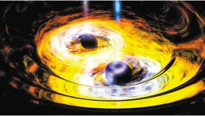 在這次探測中,科學(xué)家們確定,引力波是由兩個巨大黑洞的合并觸發(fā)的。信號的峰值、“唧唧”聲中最響亮的部分,就是兩個黑洞碰撞、合并成一個新黑洞的時刻。