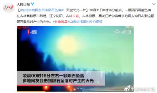 2019年10月11日0點左右,疑似一顆隕石墜落,多位吉林網(wǎng)友目擊到其墜落時產(chǎn)生的火花,黑夜映照成白天一樣。
