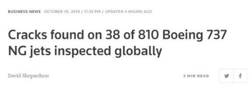 民航資源網(wǎng)2019年10月11日消息:據(jù)路透社報道,當(dāng)?shù)貢r間10月10日,波音公司表示在全球航司對810架737NG飛機(jī)檢查之后,發(fā)現(xiàn)有38架飛機(jī)存在結(jié)構(gòu)性裂縫。裂縫涉及的是“撥叉”,為機(jī)翼與機(jī)身之間的連接部件,也是機(jī)翼與機(jī)身間的主要承重元件。737NG飛機(jī)是第三代737飛機(jī)版本。