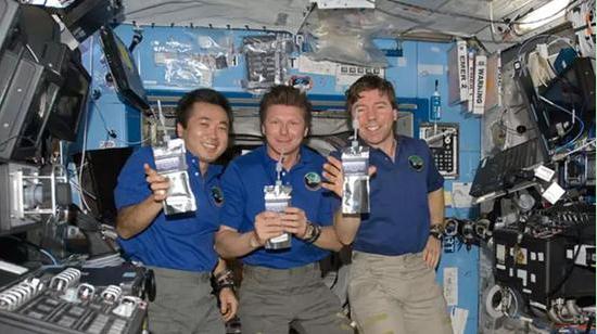 國際空間站宇航員正在快樂的引用由尿液凈化得到的純凈水。