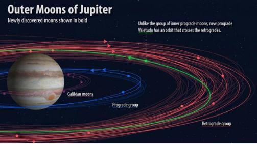 木星衛(wèi)星的各種分類,新發(fā)現(xiàn)的衛(wèi)星軌道以粗線顯示。圖中綠色線顯示的是一顆特立獨(dú)行的衛(wèi)星 Valetudo,以羅馬神朱庇特的曾孫女命名。它穿梭于逆行衛(wèi)星的軌道間,但本身軌道是順行的。