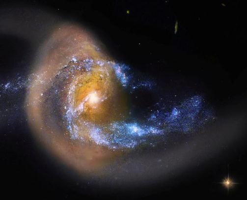這兩個星系大約在 1 億至 2 億年前開始相互糾纏、逐漸改變對方的形狀。漸漸地,它們之間出現(xiàn)了一座由恒星構(gòu)成的“橋”,包括一個環(huán)和兩條長長的“尾巴”。這座“橋”就像一根管道,將較小星系的物質(zhì)源源不斷地送往較大的星系。有了這些材料補給,星系中央得以大量形成新的恒星,因而顯得十分明亮。