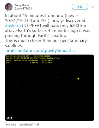 根據(jù)這些早期觀測的數(shù)據(jù),小行星比 NASA 已知近地天體數(shù)據(jù)庫中的任何其他已知近地天體更靠近我們的行星表面(實際上并未與我們的大氣發(fā)生碰撞)。模擬顯示,小行星在太平洋時間上午7:45 左右最接近地球,距離約為 3852 英里(6200 公里),從非洲南部上方通過。