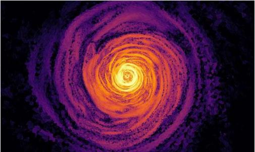 科學家用計算機模擬了類似心宿三的磁星是如何誕生的。該圖像是軌道平面的剖面圖,其中的填色代表了磁場的強度,而淺色的剖面線則反映了磁場線的方向