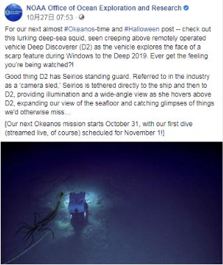 該研究團隊在 Facebook 上寫道: “檢查一下潛伏在深海中的烏賊,當遙控潛水器 Deep Discoverer (D2) 在 Windows to the Deep 2019 中探索陡坡特征時,它會潛入遙控潛水器的上方。是否有一種您被監(jiān)視的感覺?!”
