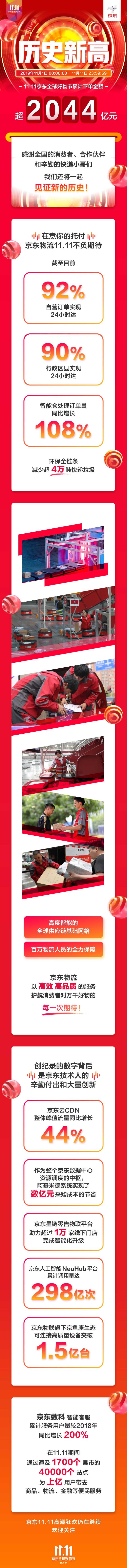 11 月 12 日消息,據(jù)京東官方消息,從 11 月 1 日零時起至 11 月 11 日 23 時 59 分 59 秒,“11.11 京東全球好物節(jié)”累計下單金額超 2044 億元,較 2018 年 11.11 實現(xiàn)大幅超越。
