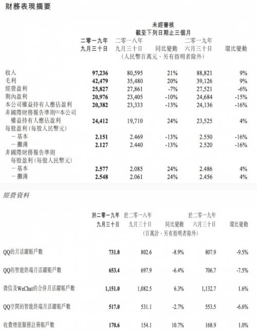 11 月 13 日消息,騰訊控股今日發(fā)布了截至 2019 年 9 月 30 日的第三季度未經(jīng)審計財報,財報顯示,騰訊第三季度總營收 972.36 億元(137.48 億美元 ),同比增長 21%;期內(nèi)盈利 209.76 億元,同比下滑 10%,本公司權益持有人應占盈利為 203.82 億元,同比下滑 13%;按非國際財務報告準則,公司權益持有人應占盈利為 244.12 億元(34.51 億美元),同比增長 24%。