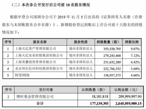公告顯示,在該次股份轉(zhuǎn)讓以及本次非公開發(fā)行全部完成后,預(yù)計阿里網(wǎng)絡(luò)將持有上市公司總股本的 9.39%,杭州信投將持有上市公司總股本的 5.00%,阿里網(wǎng)絡(luò)及其一致行動人將合計持有上市公司總股本的 14.39%;與此同時,俞熔將直接持有上市公司總股本的 1.02%,將通過其控制的天億控股、天億資產(chǎn)、美馨投資和維途投資合計持有上市公司總股本的 12.81%,俞熔的一致行動人北京世紀(jì)長河科技集團(tuán) 有限公司、高偉及徐可將持有上市公司總股本的 7.34%,俞熔及其一致行動人將合計持有或控制上市公司總股本的 21.17%。
