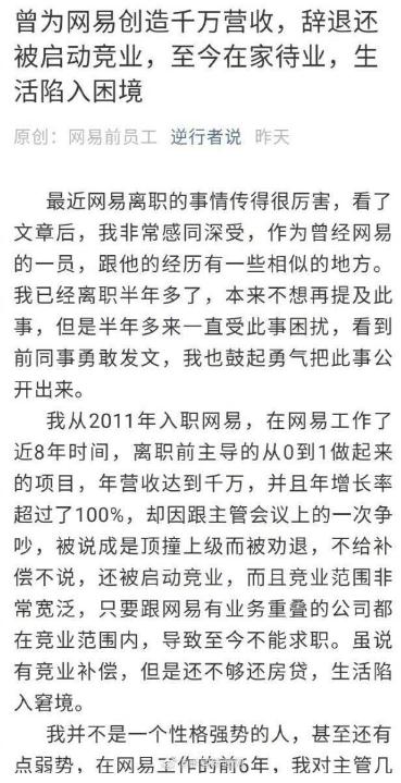 文章作者稱,自己2011年入職網(wǎng)易,在網(wǎng)易工作了近8年時(shí)間,是一名技術(shù)人員,離職前主導(dǎo)的從0到1做起來的項(xiàng)目,年?duì)I收達(dá)到千萬,并且年增長率超過了100%。因跟主管會(huì)議上的一次爭吵,被說成是頂撞上級(jí)而被勸退,不給補(bǔ)償不說,還被啟動(dòng)競業(yè),而且競業(yè)范圍非常寬泛,只要跟網(wǎng)易有業(yè)務(wù)重疊的公司都在競業(yè)范圍內(nèi),導(dǎo)致至今不能求職。雖說有競業(yè)補(bǔ)償,但是還不夠還房貸,生活陷入窘境。