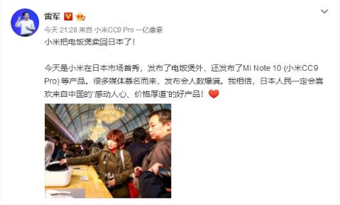 小米董事長(zhǎng)兼 CEO 雷軍表示:“小米把電飯煲賣回日本了!……很多媒體慕名而來(lái),發(fā)布會(huì)人數(shù)爆滿。我相信,日本人民一定會(huì)喜歡來(lái)自中國(guó)的‘感動(dòng)人心、價(jià)格厚道’的好產(chǎn)品!”