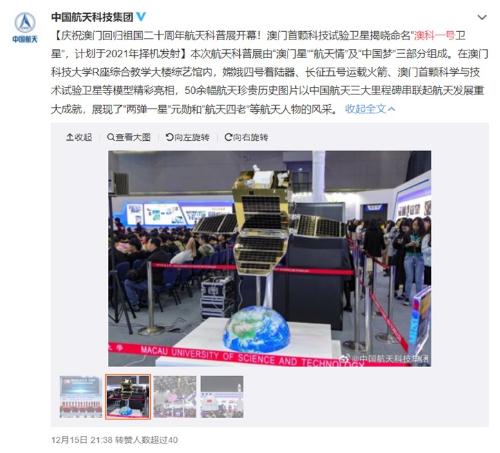 根據(jù)國家航天局的消息,2019 年 12 月 15 日,由澳門特別行政區(qū)政府、中央人民政府駐澳門特別行政區(qū)聯(lián)絡(luò)辦公室和國家航天局共同指導(dǎo)的“澳門星航天情中國夢”——慶祝澳門回歸祖國二十周年航天科普展在澳門科技大學(xué)開幕。