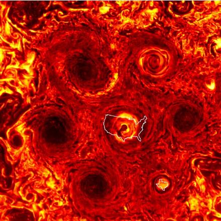在上圖中,新的氣旋風(fēng)暴在右下角顯示為亮黃色的球體,成為圍繞中心點形成的第六個氣旋風(fēng)暴。從規(guī)模上看,新的氣旋風(fēng)暴與德克薩斯州差不多大小。