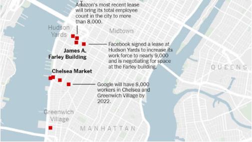 四大科技巨頭——亞馬遜、蘋果、Facebook 和谷歌——已經(jīng)在哈德遜河沿岸,從市中心到曼哈頓下城設立了大型辦公區(qū),或者在最近幾個月一直在尋找新的寫字樓,經(jīng)常為了同一個辦公場地相互競爭。