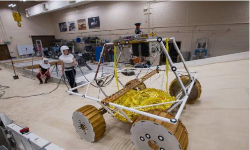 據(jù)美國宇航局官網(wǎng)報道的消息,近日在美國俄亥俄州克利夫蘭市美國宇航局格倫研究中心的“模擬月球運(yùn)行實(shí)驗(yàn)室”,團(tuán)隊已經(jīng)開始測試月球找水車的工程原型車。