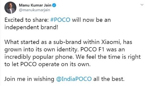 今天下午,小米全球副總裁、小米印度業(yè)務(wù)總負(fù)責(zé)人 Manu Kumar Jain 在推特宣布,POCO 品牌獨(dú)立。
