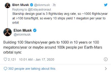 看起來(lái)馬斯克可不只是把送幾位勇敢的宇航員到火星,他的規(guī)劃可比這個(gè)大多了--將一整個(gè)國(guó)家的人送上去。馬斯克在推文中寫(xiě)道,一年建造 100 艘星際飛船,那么 10 年就可以建造 1000 艘或一年的運(yùn)力可達(dá) 1 億噸,或者每次地球和火星軌道同步時(shí)可以將 10 萬(wàn)左右的人送上火星。