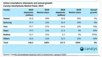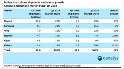 市場(chǎng)調(diào)研機(jī)構(gòu)Canalys日前發(fā)布印度手機(jī)市場(chǎng)報(bào)告,報(bào)告顯示,2019年第四季度印度智能手機(jī)市場(chǎng)增長(zhǎng)14%,總出貨量為3,900萬(wàn)臺(tái)。印度智能手機(jī)全年出貨量增長(zhǎng)8%,達(dá)到1.48億部。其中小米市場(chǎng)占有率達(dá)到29%,出貨量1120萬(wàn)臺(tái),增長(zhǎng)13%。同時(shí)小米連續(xù)10個(gè)季度雄踞印度市場(chǎng)榜首。全年出貨量達(dá)到4290萬(wàn)部。