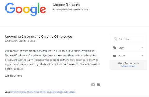 由于目前的工作日程已調(diào)整,我們正在暫停即將推出的 Chrome 和 Chrome OS 版本。我們的主要目標是確保它們繼續(xù)穩(wěn)定、安全以及對依賴它們的任何人可靠地工作。我們將繼續(xù)優(yōu)先考慮與安全相關(guān)的所有更新,這些更新將包含在 Chrome 80 中。請關(guān)注此博客以獲取更新。