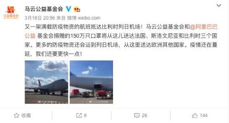 馬云公益基金會發(fā)布微博稱,“又一架滿載防疫物資的航班抵達(dá)比利時列日機(jī)場!馬云公益基金會和阿里巴巴公益基金會捐贈的 150 萬只口罩將從這兒送達(dá)法國、斯洛文尼亞和比利時三個國家。更多的防疫物資還會運(yùn)到列日機(jī)場,從這里送達(dá)歐洲其他國家。疫情還在蔓延,我們還要更快一點(diǎn)!”