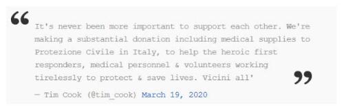 “相互支持從來沒有像現(xiàn)在這樣重要。我們正準(zhǔn)備向意大利的公民組織 Protezione Ciile 提供包括醫(yī)療用品在內(nèi)的大量捐贈(zèng),以幫助英勇的急救人員、醫(yī)務(wù)人員和志愿者不知疲倦地保護(hù)和拯救生命。”庫克在 2020 年 3 月 19 日發(fā)推文稱。