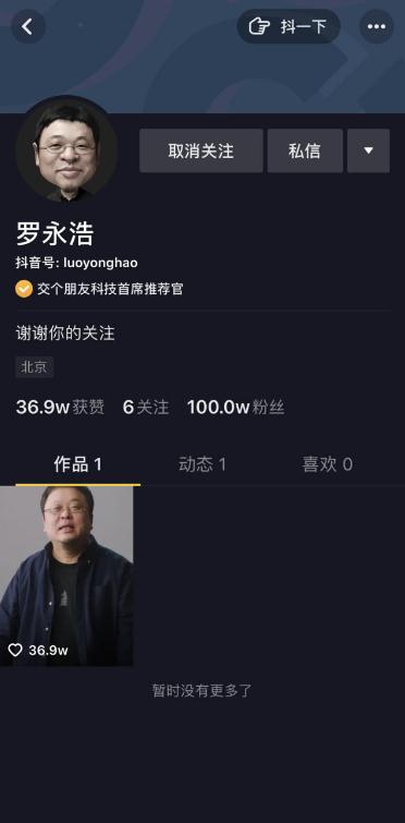 截至發(fā)稿,在不到 4 小時(shí)的時(shí)間里,首條視頻的點(diǎn)贊數(shù)已經(jīng)突破 37 萬(wàn),羅永浩的抖音粉絲突破百萬(wàn)。這或許是近來(lái)抖音粉絲增長(zhǎng)最快的賬號(hào)。