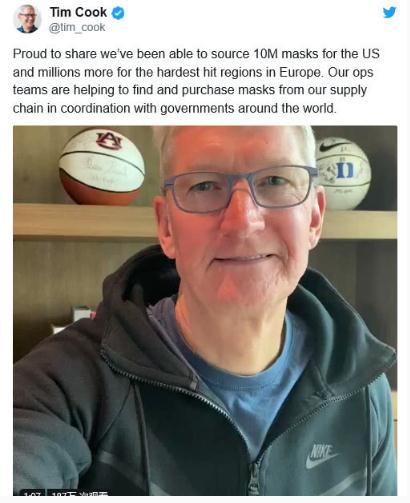 庫(kù)克當(dāng)時(shí)發(fā)布推文稱(chēng):“我們?cè)谔O(píng)果的團(tuán)隊(duì)一直在努力為抗擊新型冠狀病毒疫情的醫(yī)療保健提供者尋找補(bǔ)給。我們正在為美國(guó)和歐洲的醫(yī)療專(zhuān)業(yè)人員捐贈(zèng)數(shù)百萬(wàn)個(gè)口罩。我們感謝前線的每一位英雄。”