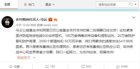 4 月 6 日,馬云再次發(fā)布微博表示,馬云公益基金會和阿里巴巴公益基金會對非洲的第二批捐贈已經(jīng)出發(fā)!這批緊急醫(yī)療防疫物資包括 500 臺呼吸機(jī)、100 萬套病毒采樣設(shè)備和提取試劑,20 萬套防護(hù)服和防護(hù)面罩,2000 個(gè)額溫槍和 50 萬雙手套,我們用最快的速度發(fā)往 54 個(gè)非洲國家。