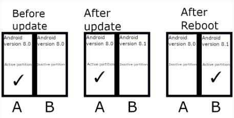 下載更新時(shí),更新程序會在后臺修補(bǔ)不活動的一組分區(qū)(一個(gè)“插槽”)。一旦將更新完成應(yīng)用到非活動插槽后,系統(tǒng)將提示用戶重新啟動設(shè)備。用戶重新啟動設(shè)備時(shí),非活動插槽將與活動插槽交換位置,從而完成更新過程。 如果引導(dǎo)新更新的插槽存在問題,則保留先前處于活動狀態(tài)的插槽。下一次更新更新時(shí),將重復(fù)此過程。
