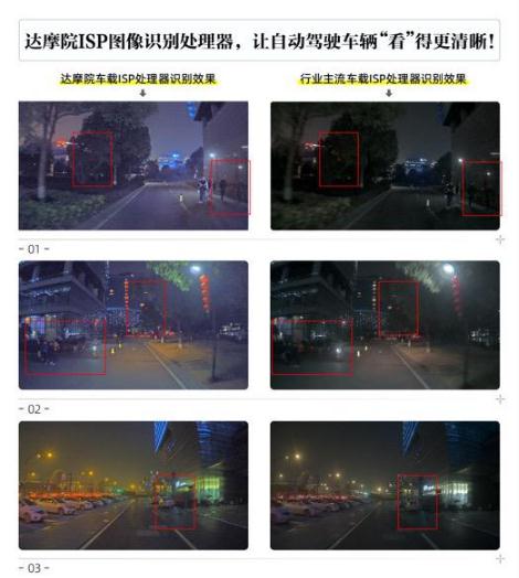 達(dá)摩院介紹,自研 ISP 處理器使得車載攝像頭在白天和夜間的圖像識(shí)別能力大幅提升。根據(jù)達(dá)摩院自動(dòng)駕駛實(shí)驗(yàn)室的路測(cè)結(jié)果顯示,使用達(dá)摩院 ISP 處理器,車載攝像頭在夜間這個(gè)最富有挑戰(zhàn)的場(chǎng)景下,圖像物體檢測(cè)識(shí)別能力比業(yè)內(nèi)主流處理器有 10% 以上的大幅度提升,原本模糊不清的標(biāo)注物也得以清晰識(shí)別。