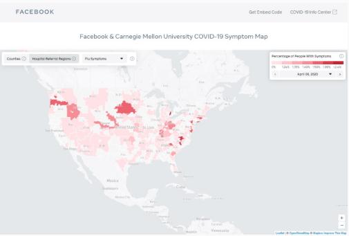 Facebook 與卡內(nèi)基梅隆大學(xué)合作,推出了一張新的互動(dòng)地圖,幫助人們及時(shí)了解冠狀病毒在美國(guó)各地的傳播情況。目前來(lái)看,該地圖是基于在美國(guó)全國(guó)各地進(jìn)行的調(diào)查數(shù)據(jù)得出,它可以讓用戶看到有多少人正在經(jīng)歷與該疾病相關(guān)的癥狀。該地圖目前只覆蓋了美國(guó),但計(jì)劃不久后將擴(kuò)大到其他國(guó)家。