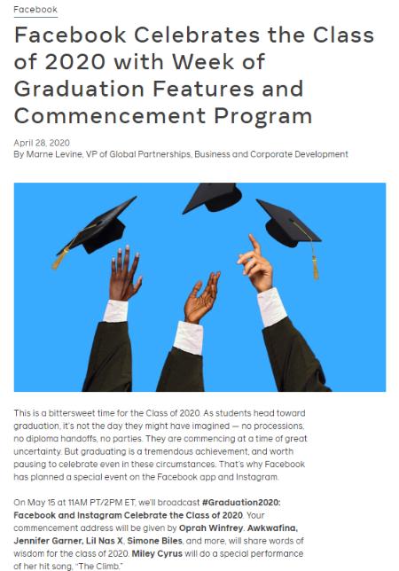 據(jù)外媒 The Verge 報(bào)道,受新冠肺炎疫情影響,全世界的學(xué)生們可能都要錯(cuò)過(guò)親臨現(xiàn)場(chǎng)的畢業(yè)典禮,所以 Facebook 決定舉辦自己的畢業(yè)典禮。這家社交媒體平臺(tái)周二宣布,它將于 5 月 15 日在 Facebook 上流媒體直播畢業(yè)典禮,屆時(shí)將有來(lái)自?shī)W普拉·溫弗瑞(Oprah Winfrey)的演講,以及 Awkwafina、Jennifer Garner、Lil Nas X 和 Simone Biles 的小型演講。Miley Cyrus 也將參加演出。雖然該節(jié)目將在 Facebook 上播出,但精選的片段也將顯示在 Instagram 上。