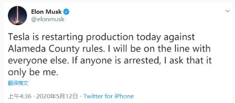 而特斯拉首席執(zhí)行官埃隆·馬斯克(Elon Musk)證實(shí),自己違反了當(dāng)?shù)氐木偷乇茈y命令,決定重新開放公司位于加州弗里蒙特的汽車制造工廠。馬斯克表示本周自己將在公司的生產(chǎn)線上工作。馬斯克寫道:“如果有人被逮捕,我要求只逮捕我一個(gè)人。”
