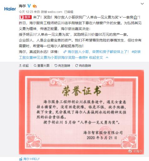 5 月 21 日上午,四川省富順縣,海爾成套服務(wù)工程師胡云川徒手爬樓,救下懸在六樓窗戶外的女童。為弘揚(yáng)其見義勇為精神、傳遞正能量,海爾智家做出嘉獎(jiǎng)決定: