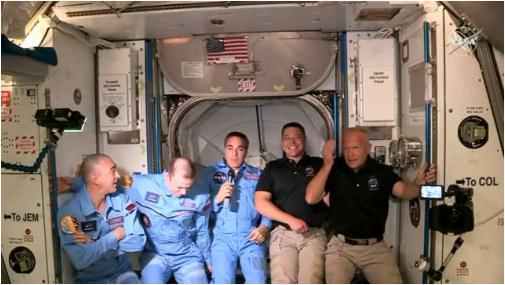 騰訊科技訊(喬輝)北京時間 6 月 1 日凌晨 1 點 23 分左右,搭乘 SpaceX 龍飛船的兩位美國宇航員先后進入國際空間站,與等待在那里的宇航員會面。