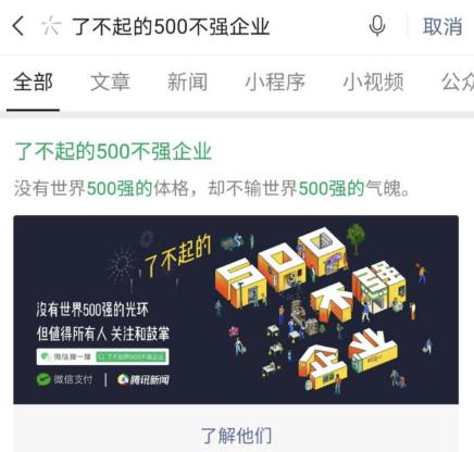 同時,在微信搜一搜活動專區(qū),用戶通過搜索關(guān)鍵詞“了不起的 500 不強企業(yè)”,即可進(jìn)入專區(qū)了解更多關(guān)于中小商家疫后重啟的相關(guān)報道。