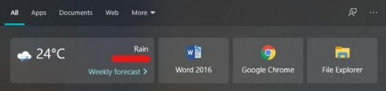 本周開始,微軟在 Search UI 中啟用了小型的天氣磁貼,當點擊任務(wù)欄中的搜索圖標時,會在左上角顯示當前的天氣狀況和溫度。而這是服務(wù)器端的改進,因此并不捆綁特定的 Windows 10 版本。也就是說,運行 Windows 10 Version 1903 或者 2004 功能更新的用戶都會看到這個磁貼。
