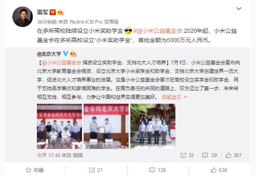 7 月 1 日,小米公益基金會(huì)宣布向北京大學(xué)教育基金會(huì)捐資,設(shè)立北京大學(xué)小米獎(jiǎng)學(xué)金和助學(xué)金,支持北京大學(xué)創(chuàng)建世界一流大學(xué),促進(jìn)北大人才培養(yǎng)事業(yè)的發(fā)展。