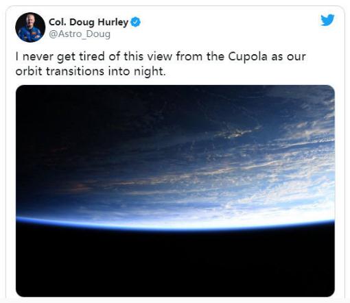 美國(guó)當(dāng)?shù)貢r(shí)間周四,赫爾利發(fā)布了一張地球從白天過(guò)渡到黑夜的照片,顯示其處于半明半暗狀態(tài)。這張圖片以給人以平和的印象,沒(méi)有任何跡象表明新冠疫情或美國(guó)非洲裔男子喬治·弗洛伊德(George Floyd)在警察執(zhí)法暴力過(guò)程中遇難引發(fā)的社會(huì)動(dòng)蕩。
