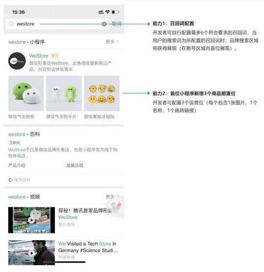通過通用品牌認(rèn)證后,品牌可自行配置最多 6 個(gè)符合要求的召回詞,當(dāng)用戶在微信“發(fā)現(xiàn)-小程序”搜索框輸入品牌配置好的召回詞后,即可看到品牌搜索區(qū)域。而通過電商品牌認(rèn)證的品牌,除了擁有和通用品牌認(rèn)證一樣的召回詞配置能力外,還可在小程序搜索結(jié)果中配置 3 個(gè)商品運(yùn)營位,用戶可直接點(diǎn)擊跳轉(zhuǎn)至相應(yīng)的商品頁面。