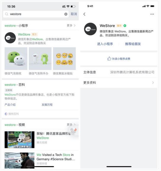以小程序 WeStore 為例,當(dāng)用戶在“發(fā)現(xiàn)-小程序”頂部搜索框輸入微信周邊、微信氣泡狗手辦等召回詞時(shí),小程序賬號(hào)的搜索結(jié)果將首位展示小程序 WeStore。