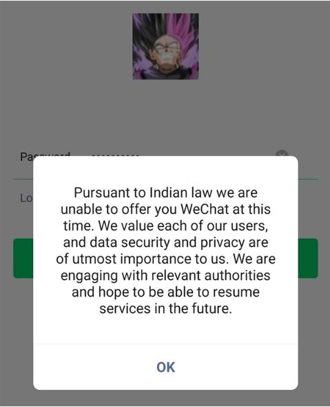 “依據(jù)印度法律,我們目前無法向您提供微信服務(wù)。我們尊重每一位用戶,數(shù)據(jù)安全和隱私對我們而言是最重要的。我們正在與有關(guān)部門積極協(xié)調(diào),希望能在未來恢復(fù)服務(wù)。”