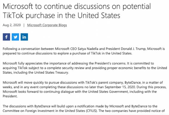 微軟稱,公司將快速行動,在幾周內(nèi)推進與 Tik Tok 母公司字節(jié)跳動的討論,無論如何也要在不遲于 2020 年 9 月 15 日時間內(nèi)完成討論。在這一過程中,微軟期待繼續(xù)與美國政府對話,包括總統(tǒng)特朗普。