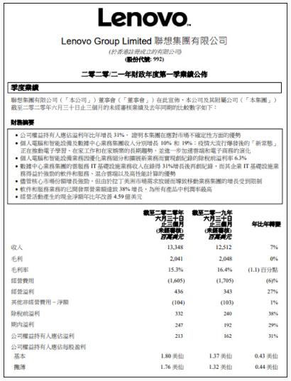 8 月 13 日,聯(lián)想集團(00992.HK)公布截至 2020 年 6 月 30 日的 20/21 財年第一財季業(yè)績。財報顯示,聯(lián)想集團當(dāng)季營業(yè)額達到 133.48 億美元(約合 946 億人民幣),同比增長7%。稅前利潤達到 3.32 億美元(約合 23.5 億人民幣),同比增長 38%。凈利潤達到 2.13 億美元(約合 15 億人民幣),同比增長 31%。
