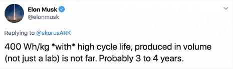 馬斯克周一在推特上寫道,“400Wh/kg *具有*高循環(huán)壽命,批量生產(chǎn)(不只是實(shí)驗(yàn)室生產(chǎn))并不遙遠(yuǎn)??赡苄枰?3 到 4 年。”