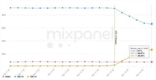 根據(jù)移動分析公司 Mixpanel 的數(shù)據(jù),iOS 14 正式版推出 5 天時間內(nèi),更新的采用率已經(jīng)達(dá)到約 26% 的活躍 iPhone、iPad 和 iPod touch 設(shè)備,數(shù)據(jù)中包括 iPadOS 14。