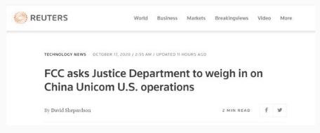 信函中,F(xiàn)CC 詢問美國各執(zhí)行分支機構(gòu):“(中國聯(lián)通美洲公司)是否以及如何受到中國政府的利用、影響和控制,以及與(美國)國家安全和執(zhí)法相關(guān)的風(fēng)險。”FCC 還詢問,有關(guān)“緩解措施是否能夠解決任何已經(jīng)確定了的擔(dān)憂”問題。